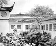 中國(guó)園林的園墻常設(shè)洞門。洞門僅有門框而沒(méi)有門扇,常見(jiàn)的是圓洞門,又稱月亮門、月洞門;還可作成六角、八角、長(zhǎng)方、葫蘆、蕉葉等不同形狀。其作用不僅引導(dǎo)游覽、溝通空間,本身又成為園林中的裝飾。通過(guò)洞門透視景物,可以形成焦點(diǎn)突出的框景。采取不同角度交錯(cuò)布置園墻、洞門,在強(qiáng)烈的陽(yáng)光下會(huì)出現(xiàn)多樣的光影變化。