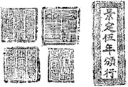 在1985年年底舉辦的"安徽省文物珍品展覽會"上,有一套宋代"金銀見錢關(guān)子"印版,引起行家們的廣泛重視。這套印版一共八塊,是安徽省東至縣的廢品收購站從農(nóng)民手中按廢品收購來的。東至縣地方志辦公室聞訊后,將此套印版從廢品站價撥過來,并轉(zhuǎn)給了縣文物部門。安徽省博物館盧茂村先生向余詳細地介紹了這套印版的發(fā)現(xiàn)、實物規(guī)格及鑒定情況。