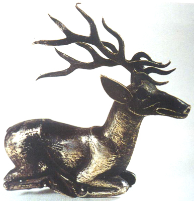 陜西神木納林高兔出土。戰(zhàn)國(guó)。圓雕。共五件,三雌兩雄,這是雄鹿之一。昂首前視,兩耳豎立,四肢屈曲,作臥伏狀。頭部雙角彎曲向后傾斜,分為五叉,系另鑄后插于頭部。長(zhǎng)蹄尖出,狀如柳葉。姿態(tài)雄健,形象鮮明,為匈奴雕刻工藝之杰作。