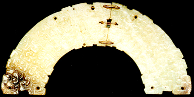 湖北隨縣擂鼓墩出土。玉料呈青色,有褐色浸痕。體扁平,形如半環(huán),邊緣有對稱的凸脊。兩端各飾一張口的龍首。以繩索紋將器分隔成三塊,每塊隱起不規(guī)則的云雷紋、蠶紋等,以示龍形的五官和鱗甲。兩端各有兩孔,中央部位有大小不等的十一個圓孔。其中六孔穿以金絲,將斷開的兩部分綴合在一起。其它各孔供佩系用。
