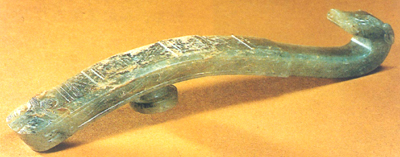 山東曲阜魯故城出土。戰(zhàn)國。玉料呈青色,有浸痕。呈鏟形,勾身飾獸面紋。雙眼突出,長眉上卷,左右和脊背用陰線刻出卷曲紋。龍形紋、卷云紋等。勾端作回首獸頭狀。背面圓形鈕,并飾菱形紋勾云紋等。形制特殊,雕鏤精巧。