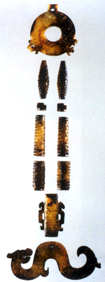 山東曲阜魯國故城出土。戰(zhàn)國。青黃色。由璧、珠、管、夔龍等十一件組成。璧上有方孔,下有雙龍形耳。棗核形玉管一對。珠一對,呈方形,有穿孔。圓柱形管兩對。扁圓形管一件,兩側有夔龍耳。夔龍一件,回首,彎身,卷尾,頭頂有角,身有圓孔。各件皆飾谷紋。以繩穿連,為一組完整的佩飾。