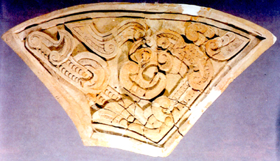 鐘舞部模。其各邊長(zhǎng)度,內(nèi)側(cè)12、外側(cè)36.5、左右側(cè)分別為18.5和22厘米,厚4-5厘米。紋飾為浮雕式,鳳眼凸出,冠高似飄起,篆下鉤,身卷曲呈C形,轉(zhuǎn)角處有一翅,填鱗片紋。造型渾樸,富于特色。