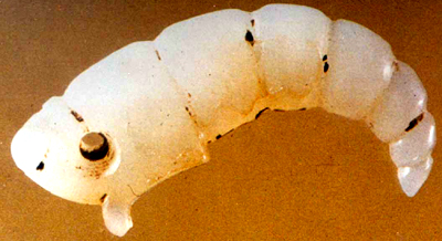 河南三門峽上村令出土。春秋。玉料呈白色,純潔瑩潤,器表光亮。上圓粗而下細尖,軀體彎曲,呈家蠶形。頭部有外突的雙目。從頭部起向下逐漸收縮。軀體雕琢七條周線紋,愈往尾部陰線紋愈密。此器上部有一個兩面對鉆的小孔,可供佩系。