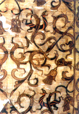 湖北江陵馬山楚墓出土。見于龍鳳虎紋繡羅單衣衣面;野咨_繡地。繡線可見紅棕、棕、黃綠、土黃、桔紅、黑、灰色。圖案由龍、鳳、虎三種動物組成。一側(cè)為鳳鳥,雙翅張開,有花冠,腳踏小龍。另一側(cè)是滿布紅黑(或灰)色條紋的斑斕猛虎,張牙舞爪朝前方奔逐大龍。大龍作抵御狀。圖案色彩鮮艷,繡工精細。