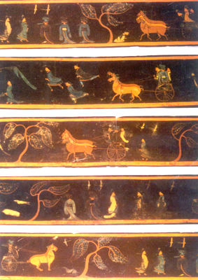湖北荊門包山出土。戰(zhàn)國中期。畫面用土黃、桔紅、海藍(lán)、棕四色繪于漆奩之上,有人物26個,驂車(三馬駕車)、駢車(二馬駕車)各兩乘,大雁9只,狗2只,豬1頭,樹5棵,構(gòu)成一幅聘禮行迎圖。畫面用樹木分隔為5段,又以犬為間隔,按其情節(jié)分為兩大部分。一部分以奔馳的車馬、冕冠垂纓的乘人、襦衣青幘的隨從及拜接者組成,表現(xiàn)的是一派聘問出行途中的景象。另一部分則由氣宇軒昂的褒衣博帶者與待發(fā)的駢車為主體,表現(xiàn)的是一幅主國出使迎賓的場面。此畫繪于漆奩蓋部的外壁,出土后與夾纻胎分離。畫中的驂車和胼車為研究戰(zhàn)國的馬車型制提供了重要的資料。