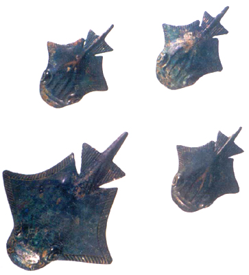 遼寧喀左南洞溝出土。春秋晚期。馬飾作鰩魚形。大者反面有兩橋形鈕。小者有十字形鈕,以備穿帶。出于北方民族石槨墓。象鰩魚形,在青銅器中僅此一見。