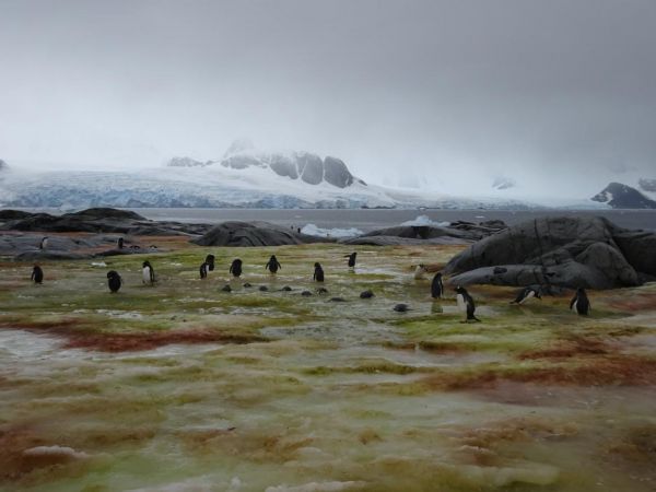 鮮綠色的單細(xì)胞藻生長(zhǎng)在巖石表面,藍(lán)綠藻生長(zhǎng)在陸原冰中,雪中生長(zhǎng)的紅色藻可以把白色的雪染成玫瑰色,十分美麗。冰雪融化的溪流中常有皺溪苔類生長(zhǎng)。從企鵝棲息地流過的溪水中,由于含有豐富的氮、磷營(yíng)養(yǎng)鹽,藻類的生長(zhǎng)則更加繁茂。