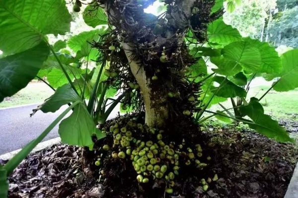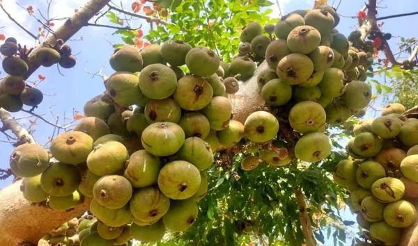 聚果榕為??瞥>G大喬木,高達(dá)25—30米,胸徑60—90厘米,果實(shí)數(shù)量眾多,常常一串串,一嘟嚕地掛滿樹干,且由生至熟,色彩各異,或紅或黃,或青或綠,煞是惹人喜愛。果子成熟后香甜可口,令人垂涎欲滴。