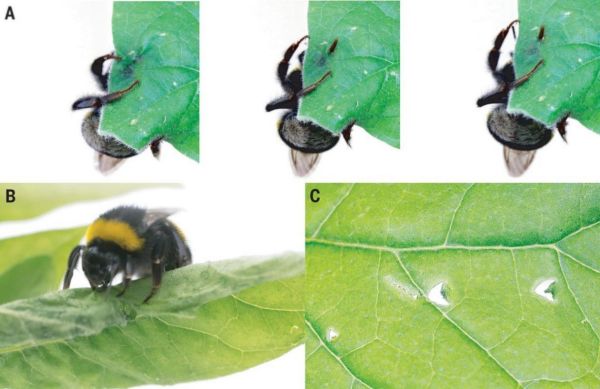 在研究熊蜂時(shí),科學(xué)家們發(fā)現(xiàn)了一件怪事:以花粉花蜜為食的熊蜂,在一些時(shí)候會(huì)用它們的口器戳破開花植物葉片,在葉上留下形狀獨(dú)特的孔洞,但它們并不會(huì)食用這些葉片,也不會(huì)將葉片帶回蜂巢,這又是為什么呢?