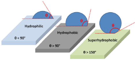 我們通常通過測(cè)量液滴邊緣與固體表面之間的夾角(即接觸角)來確定一種固體表面親水或者疏水的作用大小。不難看出,當(dāng)水滴在固體表面完全鋪展開時(shí),接觸角應(yīng)為0°,而如果水滴完全保持球形,接觸角則應(yīng)為180°。