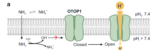對于氯化銨如何激活OTOP1蛋白,研究人員提出了一種可行的生物化學(xué)機(jī)制:當(dāng)細(xì)胞攝取氯化銨,銨根離子(NH4+)可以轉(zhuǎn)化為氨氣(NH3),NH3進(jìn)入細(xì)胞內(nèi),再轉(zhuǎn)變?yōu)镹H4+,從而造成細(xì)胞內(nèi)堿性,細(xì)胞外H+濃度大于細(xì)胞內(nèi)H+濃度,H+濃度差導(dǎo)致OTOP1離子通道打開,從而使氯化銨味道被感知,類似于酸味感知。
