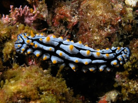 葉海蛞蝓Phyllidia varicosa,鮮艷的體色和周圍形成明顯對(duì)比,大搖大擺的它們一定有著保護(hù)自己不被捕食的秘訣。