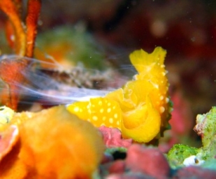 釋放毒液的Phyllidia flava,可見(jiàn)毒液的黏稠,沾到便不易甩脫。