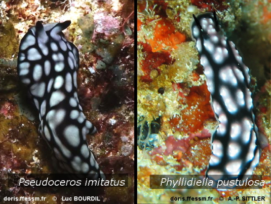 來(lái)自其他無(wú)脊椎動(dòng)物門的物種也上了偽裝葉海蛞蝓的車,吃海鞘的擬態(tài)海扁蟲Pseudoceros imitatus就是其中一員。它們?cè)陬伾?、圖案和大小上與常見(jiàn)的劇毒葉海蛞蝓 Phyllidiella pustulosa驚人的相似。
