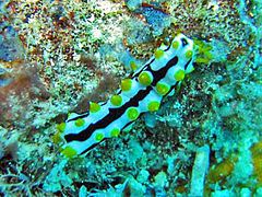 格皮氏海參在幼年模仿葉海蛞蝓,幼小的它們參體色鮮艷,有白色或藍(lán)色的斑點(diǎn),點(diǎn)綴著黑色線條,體表也長(zhǎng)著大而夸張的橙色或黃色結(jié)節(jié),和葉海蛞蝓非常接近,它們利用擬態(tài)來(lái)保護(hù)自己免受魚類捕食者的侵害。