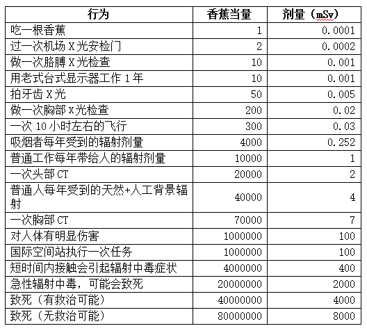 其實,國際上有一個用來判斷輻射對生物體影響的計量單位,叫“希沃特”(簡稱Sv)。但這個單位很抽象,為了更形象地理解電離輻射的影響,有人提出了“香蕉當量”的概念,就是指把各種行為帶給人的輻射劑量轉(zhuǎn)換成“吃了多少根香蕉”。