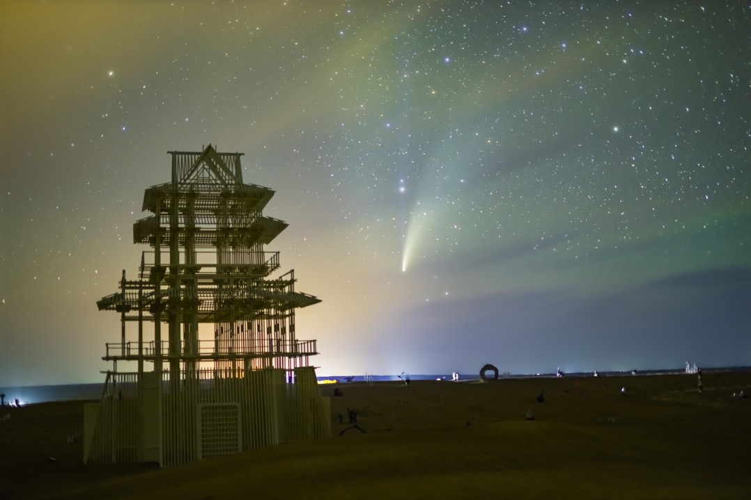 甘肅省武威市民勤縣,2019年剛剛脫貧摘帽的原國(guó)家級(jí)貧困縣,縣城毗鄰沙漠而建,縣城居住人口僅十余萬(wàn)人。當(dāng)?shù)胤e極在沙漠邊緣處修建了一系列當(dāng)代藝術(shù)風(fēng)格的雕塑建筑。畫(huà)面中,新智彗星與地面上的桁架閣樓造型的雕塑,以及被縣城的光污染照亮的彩云相映成趣。