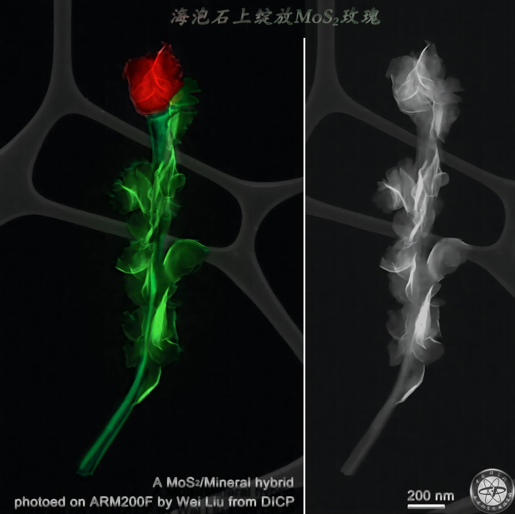 以綿延千萬年錘煉而生的天然礦物海泡石為基底,利用現(xiàn)代納米科技,將特性新奇的MoS2納米片負載其上。以納米片為花瓣,以礦物纖維為花柄,大自然的亙古綿長與電子顯微科技之光的浪漫融合,讓我“送你一朵玫瑰花”吧。