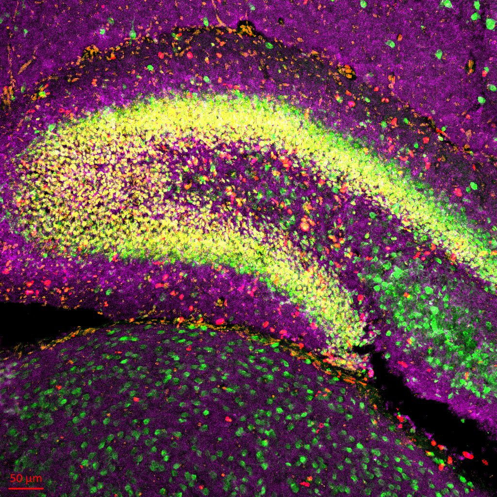 這張圖片是免疫熒光染色的出生后第7天小鼠的腦切片,層掃了22張照片的正交投影結(jié)果,位置為海馬的尺狀回(DG區(qū))。其中綠色為神經(jīng)元(抗體公司:Millipore,貨號(hào):ABN78,Anti-NeuN),紅色為Brdu標(biāo)記增殖,紫色為細(xì)胞質(zhì),黃色為細(xì)胞核。