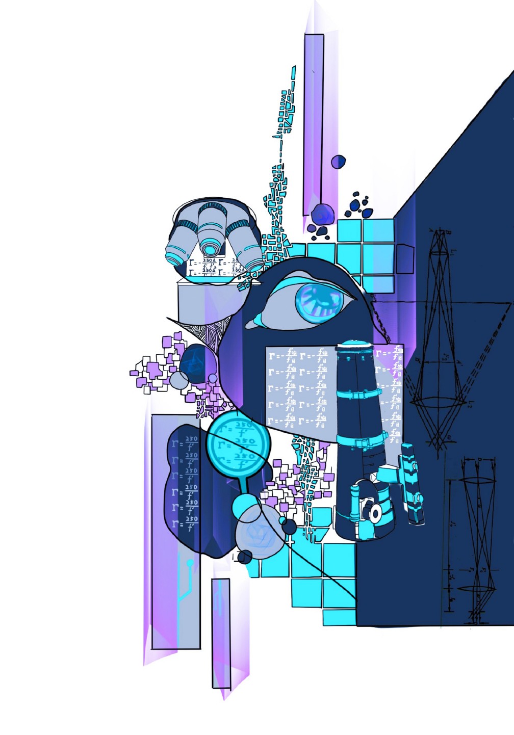 整幅畫面以人眼為中心,在四周巧妙布置放大鏡、顯微鏡、望遠(yuǎn)鏡等目視光學(xué)儀器和其對應(yīng)的光路圖、視放大率公式,但是這些儀器并沒有完全按照寫實(shí)方案還原而是通過自由的變換構(gòu)成了各種或抽象或具體的符號,在藝術(shù)的領(lǐng)域進(jìn)行表達(dá)。