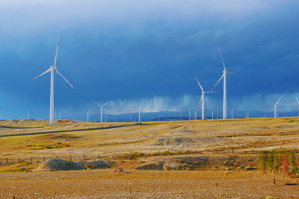 風(fēng)電作為一種清潔、可再生能源,對(duì)我國(guó)如期實(shí)現(xiàn)碳達(dá)峰、碳中和目標(biāo)有著重要意義。本組照片拍攝于我國(guó)新疆的五彩灘景區(qū)附近,該區(qū)域地域遼闊、風(fēng)能資源尤其豐富,因此建設(shè)了大型的風(fēng)力發(fā)電網(wǎng)站。相對(duì)傳統(tǒng)的火電、核電等發(fā)電方式,通過風(fēng)輪機(jī)將風(fēng)能轉(zhuǎn)化為機(jī)械能,再拖動(dòng)發(fā)電機(jī)發(fā)電要更加綠色、環(huán)保。呼呼的大風(fēng)不僅帶動(dòng)著風(fēng)車工作,也悄悄雕琢形成了當(dāng)?shù)鬲?dú)特的地貌特征,由于巖層間抗風(fēng)化能力的強(qiáng)弱程度不一,形成了參差不齊的輪廓,巖石礦物質(zhì)成分的不同又幻化出斑斕色彩,美輪美奐,讓人心曠神怡。