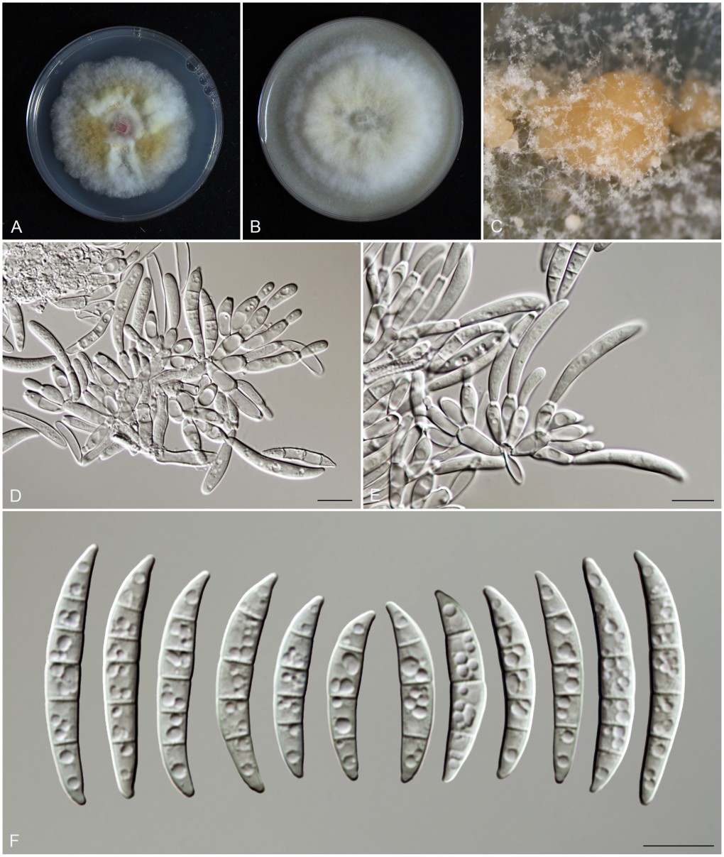 圖為鐮刀菌屬內的菌落及顯微形態(tài),該菌株分離于四川省遂寧市采集的小麥赤霉病的病穗處。(A-B)PDA,OA上,25 C、黑暗條件下培養(yǎng)7天,菌落正面形態(tài)圖;(C)康乃馨葉片上著生的分生孢子座;(D-E)分生孢子座上的分生孢子梗和產孢瓶梗;(F)分生孢子座上的大型分生孢子。圖版的所有標尺均為10微米