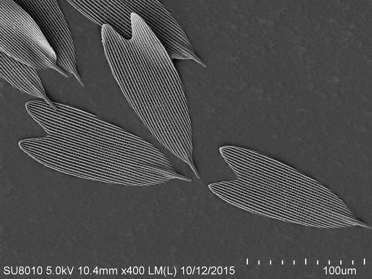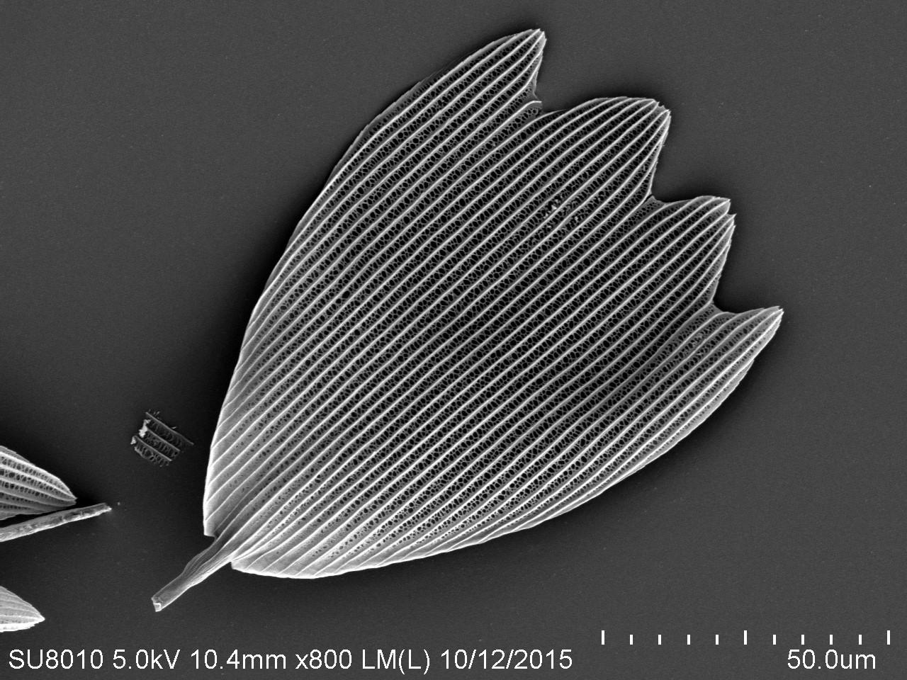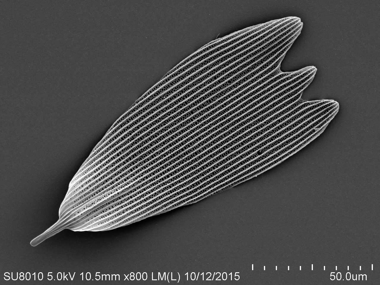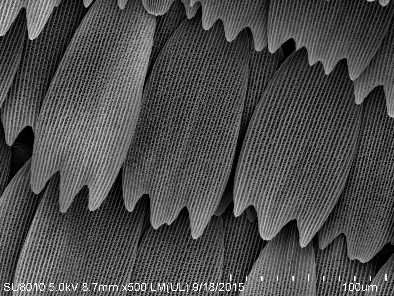 本作品取自蝴蝶翅膀一小塊,粘于樣品臺、噴金后在電鏡下觀察,拍攝倍數(shù)由低到高,可見磷片的微觀結(jié)構(gòu)和磷片上的花粉粒。