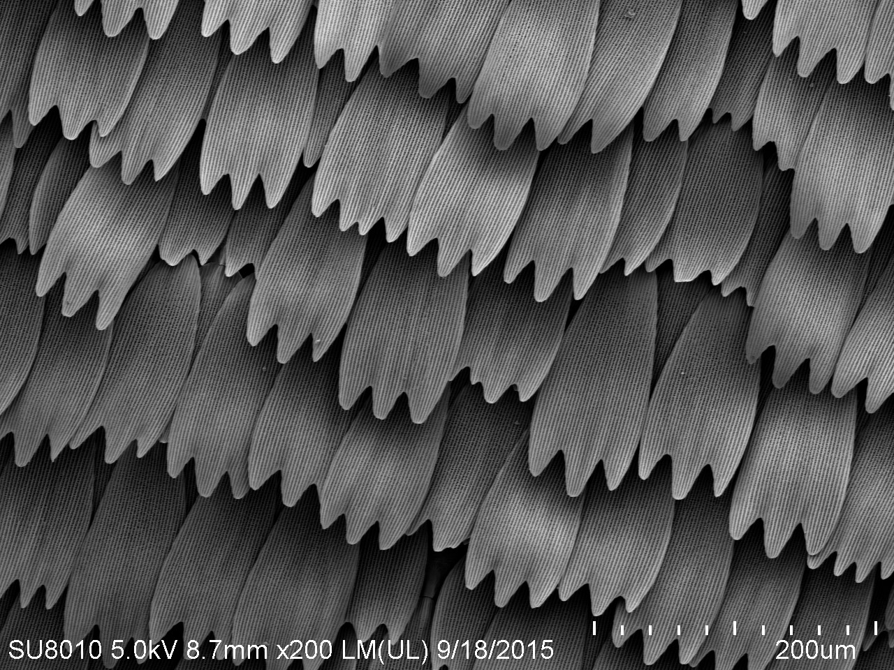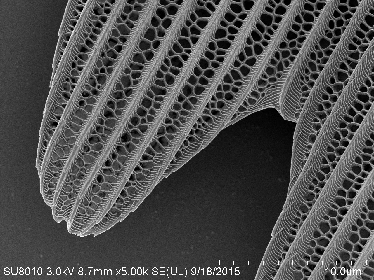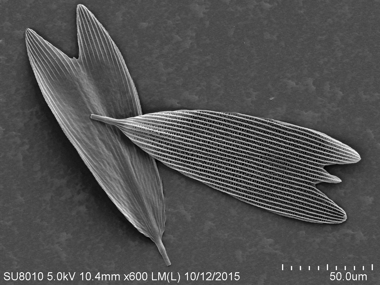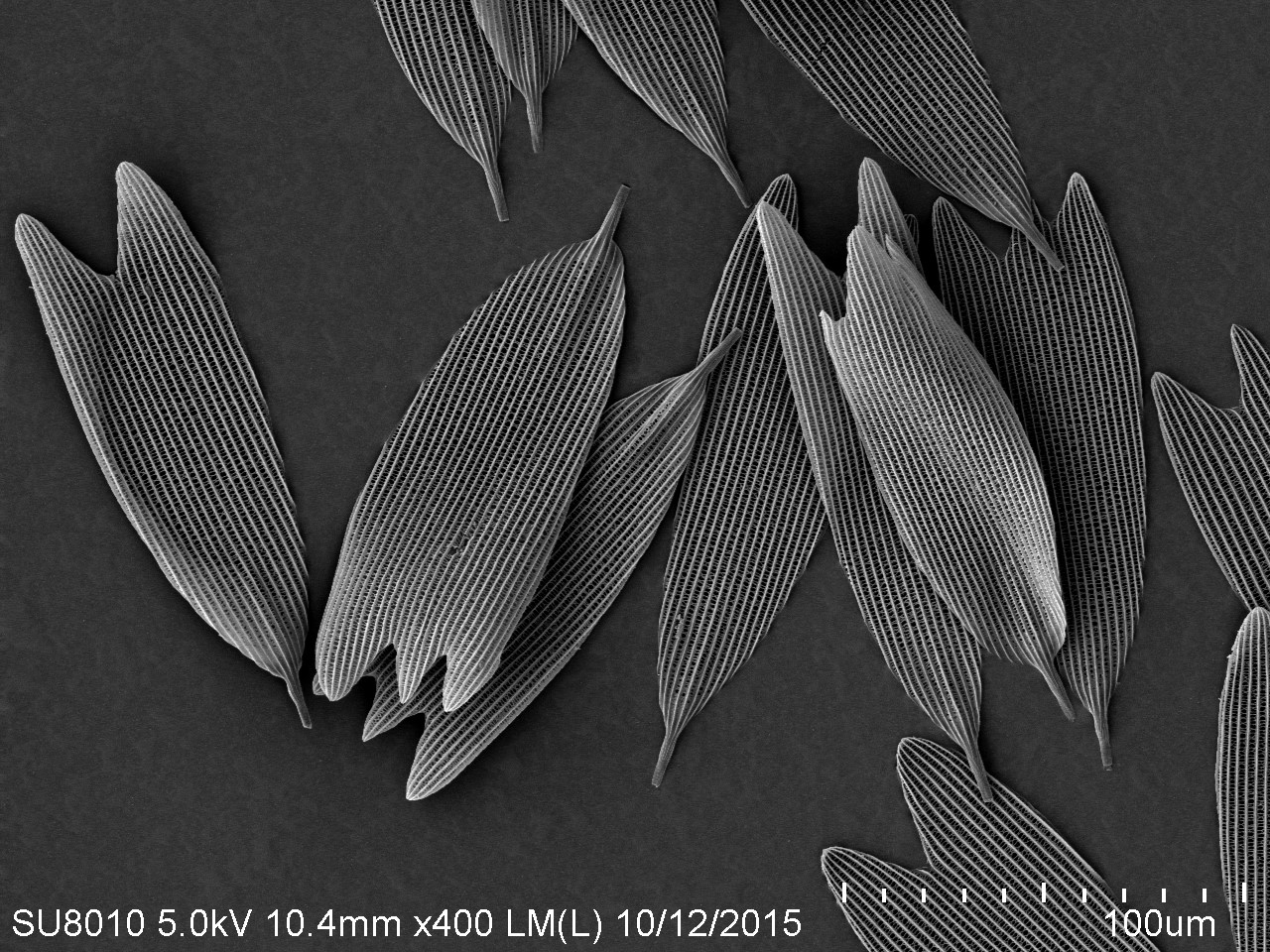 本作品取自蝴蝶翅膀一小塊,粘于樣品臺、噴金后在電鏡下觀察,拍攝倍數(shù)由低到高,可見磷片的微觀結(jié)構(gòu)和磷片上的花粉粒。