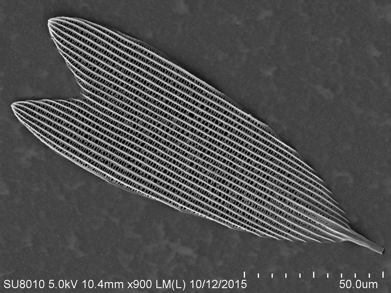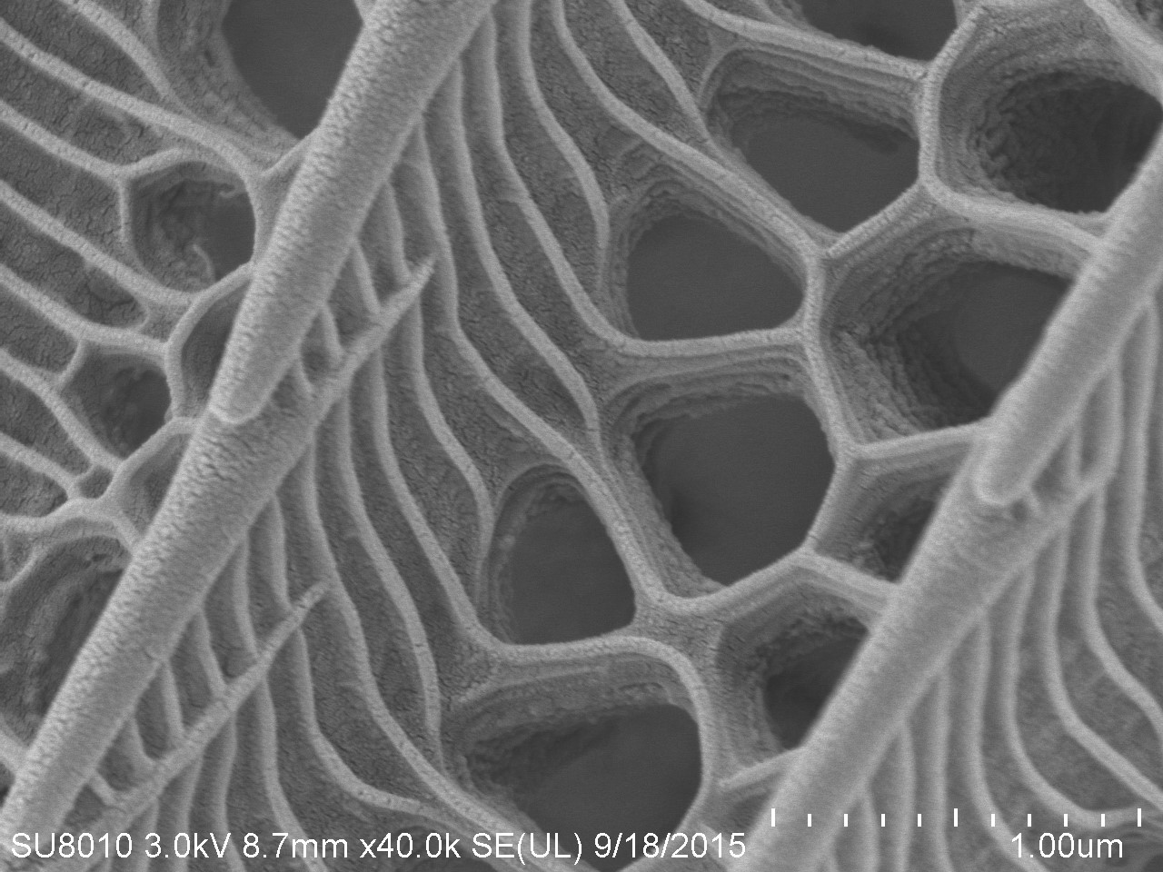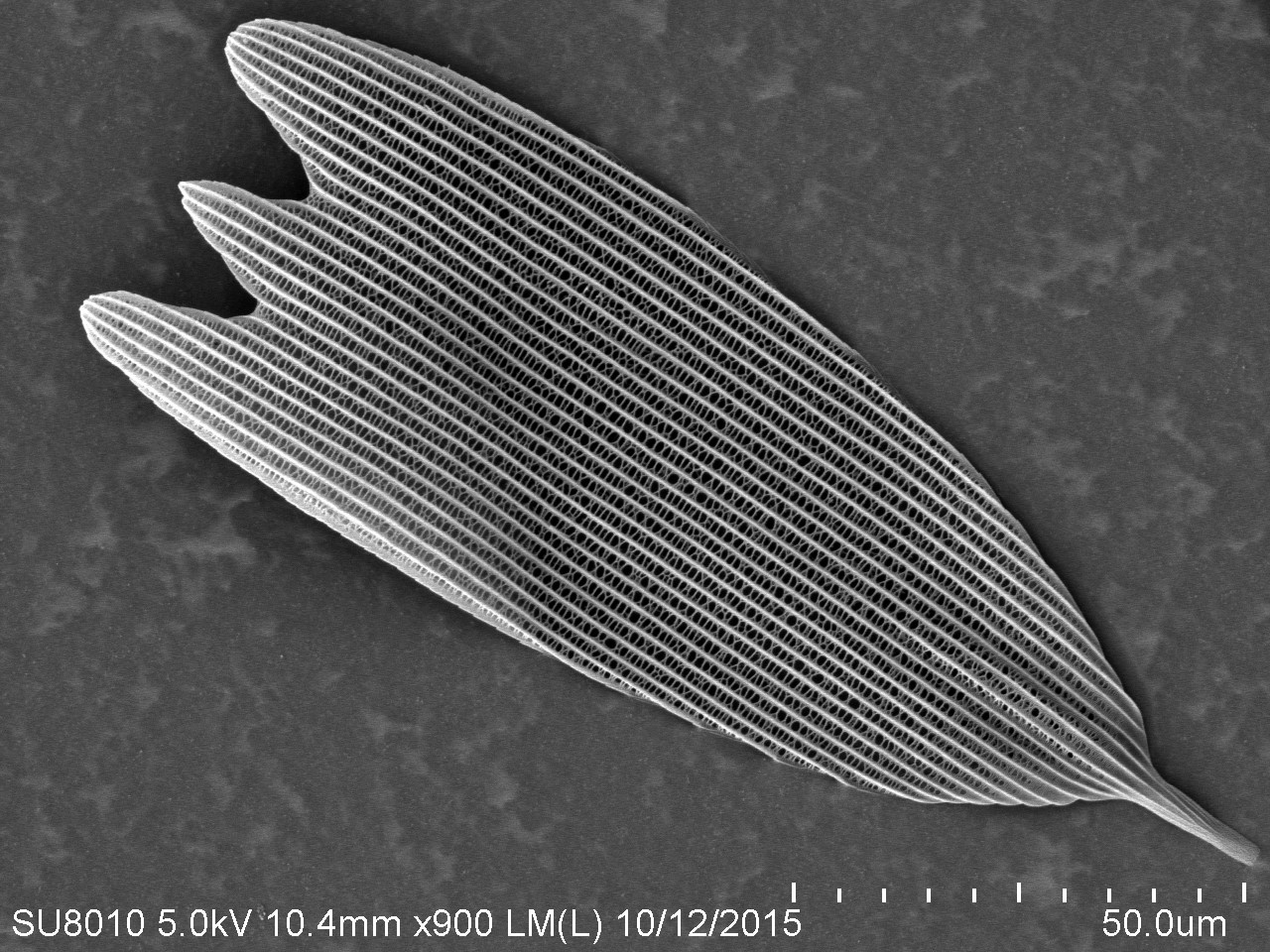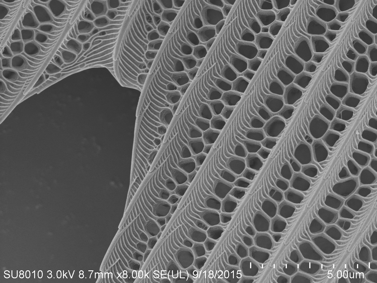 本作品取自蝴蝶翅膀一小塊,粘于樣品臺、噴金后在電鏡下觀察,拍攝倍數(shù)由低到高,可見磷片的微觀結(jié)構(gòu)和磷片上的花粉粒。