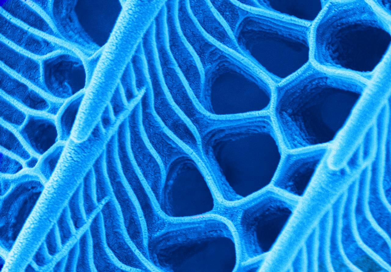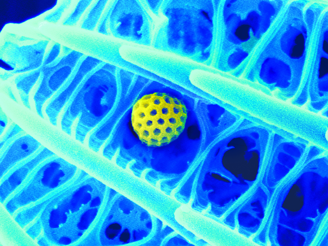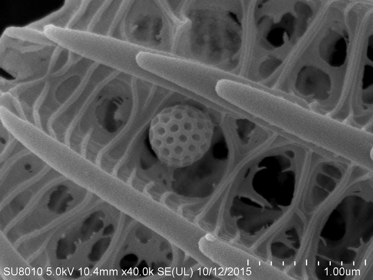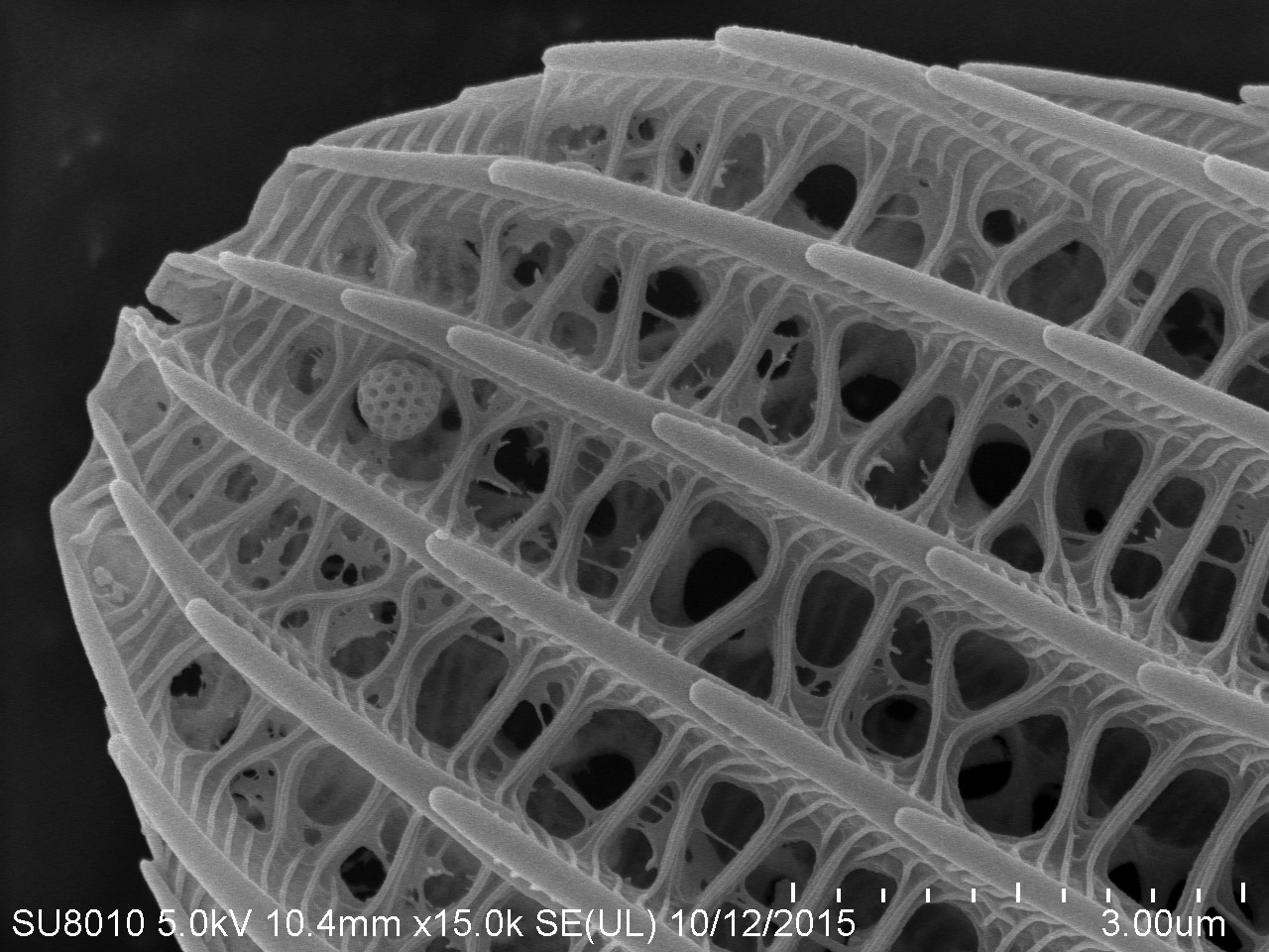 本作品取自蝴蝶翅膀一小塊,粘于樣品臺、噴金后在電鏡下觀察,拍攝倍數(shù)由低到高,可見磷片的微觀結(jié)構(gòu)和磷片上的花粉粒。