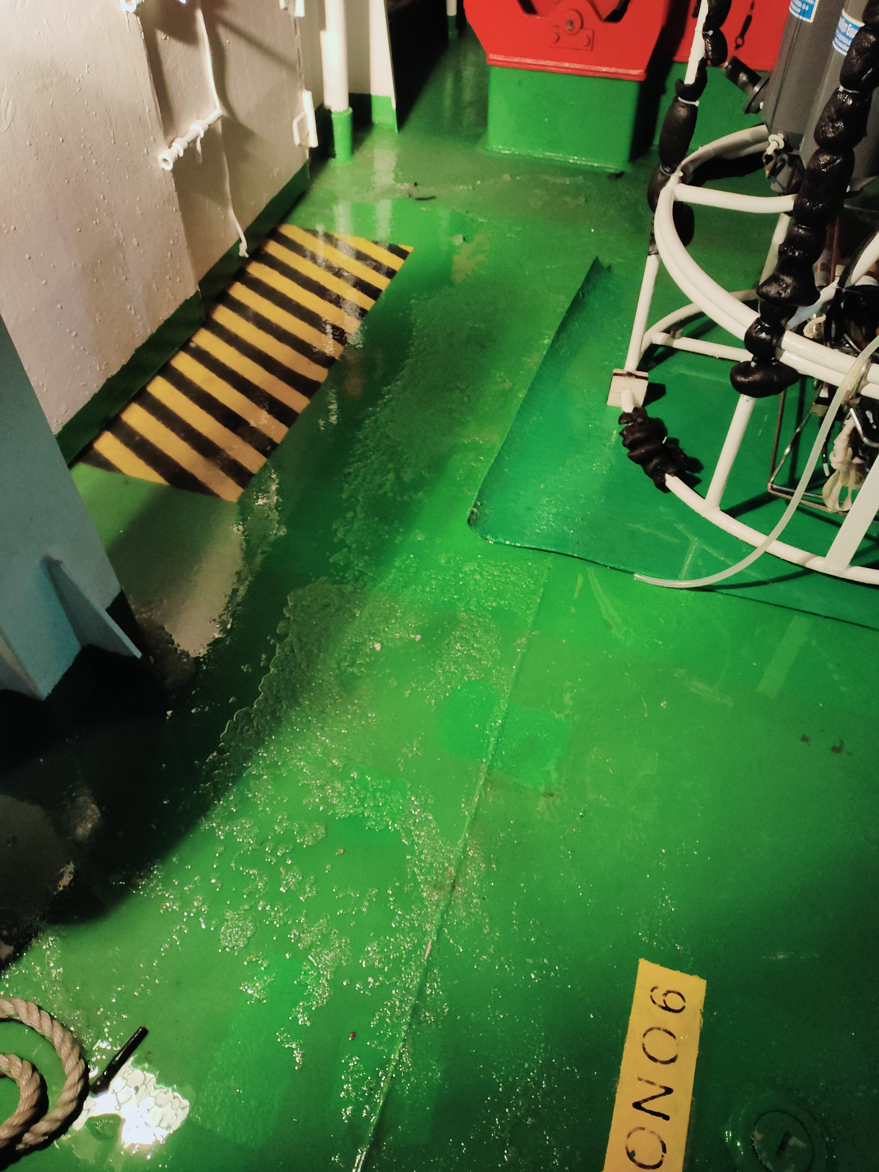 該照片于2022年2月,“創(chuàng)新一”科考船執(zhí)行中國科學(xué)院煙臺(tái)海岸帶研究所黃渤海冬季開放航次期間用手機(jī)拍攝所得。夜晚到站進(jìn)行CTD下放作業(yè)時(shí)海上突降大雪,在狂風(fēng)的加持下使得海水都結(jié)成冰,凍結(jié)在甲板上,掛在安全門和采水器的出水口上。科考隊(duì)員依然穿戴好救生衣、安全帽堅(jiān)守崗位,成功取得寶貴的冬季樣品。無論在哪,都有那一抹紅色如此溫暖而堅(jiān)定。