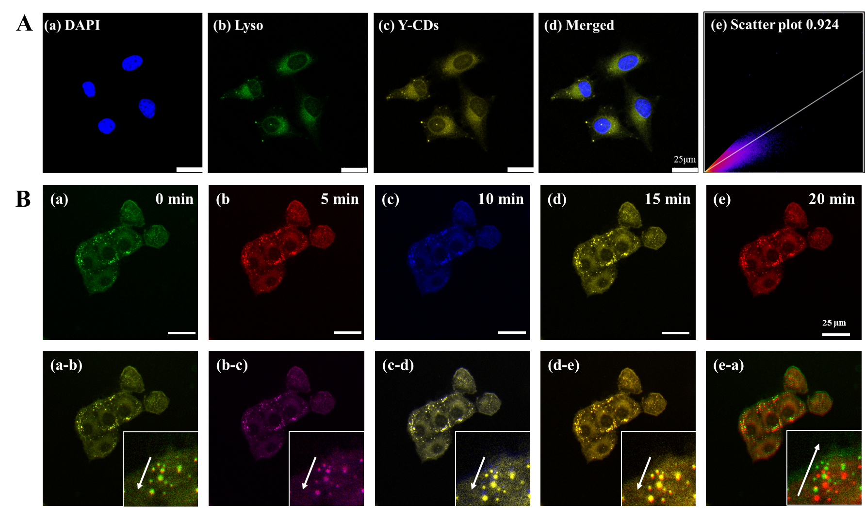 黃色碳納米點可以精確靶向細胞中的溶酶體(圖A),并且在藥物刺激下,可以實時檢測溶酶體的移動路徑(圖B),實現(xiàn)活體細胞中的溶酶體GPS定位。
