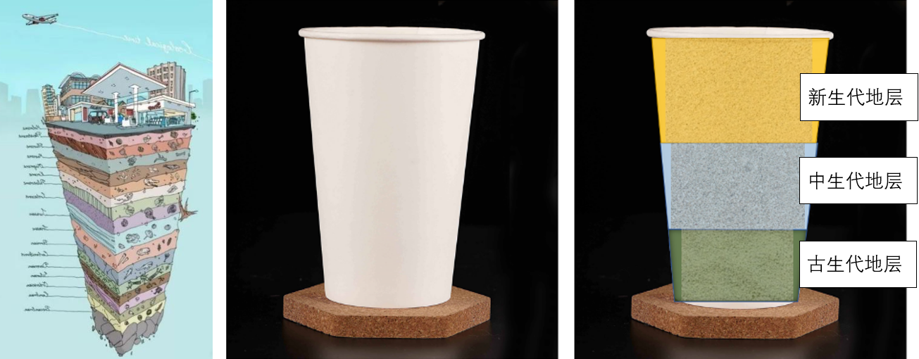 親自動手制作地層杯,了解地球46億年地層變化,把紙杯進行分層,下部地層為時代較老的古生代地層,中部地層為爬行動物盛行的中生代地層,上部地層為哺乳動物時代的新生代地層。
