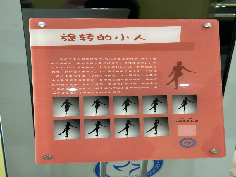 展品中小人的旋轉(zhuǎn)方向,有人看起來是順時針,而有人看是逆時針;有時看起來是順時針,有時是逆時針的。而實際上小人一直是按照一個方向旋轉(zhuǎn)的。這一特殊現(xiàn)象與我們知覺習性有關,人們通常偏向于從上方看物體,而較少有從下看物體的機會。這個旋轉(zhuǎn)的小人其實并不是直面著觀察者的,當看到她在順時針旋轉(zhuǎn)時,其實我們的視角是由一點從上往下看...