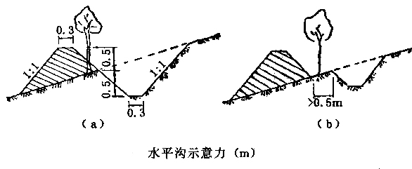 在坡面不平、覆蓋層較厚、坡度較大的丘陵坡地,采用水平溝,即沿等高線修筑,溝底用來攔截坡地上游降雨徑流,使其變?yōu)橥寥浪K綔系脑O(shè)計和修筑需依據(jù)坡面坡度、土層厚度、土質(zhì)和設(shè)計雨量而定。其原則是:水平溝的溝距和斷面大小,應(yīng)以保證設(shè)計頻率暴雨徑流不致引起坡面水土流失。陡坡、土層薄、雨量大,溝距應(yīng)小些;反之可大些。坡陡,溝深而窄;坡緩,溝淺而寬。一般溝距為3~5m,溝口寬0.7~1m,溝深0.5~1.0m。水平溝容積比魚鱗坑大,故蓄水量也大。為防止山洪過大沖壞地埂,每隔5~10m,設(shè)置瀉洪口,使超量的徑流導(dǎo)入山洪溝中。為使雨水在溝中均勻,減少流動,每隔5~10m,留—道土擋,其高度為溝深的1/2~1/3。