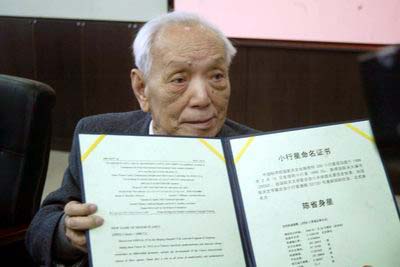 剛剛度過93歲生日的陳省身2日說:“把我的名字跟天上的星星聯(lián)系在一起,我非常榮幸。我是研究數(shù)學(xué)的,數(shù)學(xué)歷史上最偉大的數(shù)學(xué)家是高斯,他最早的工作就是小行星的研究,F(xiàn)在我有機(jī)會跟小行星有聯(lián)系,覺得非常快樂!