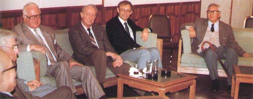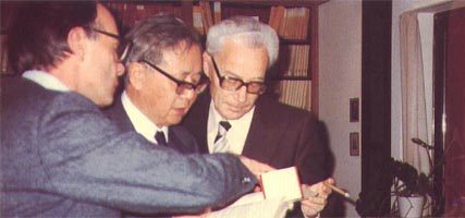 1979年華羅庚與德國(guó)數(shù)學(xué)會(huì)會(huì)長(zhǎng)希爾茨布魯赫、數(shù)學(xué)家艾柯曼在一起。 |