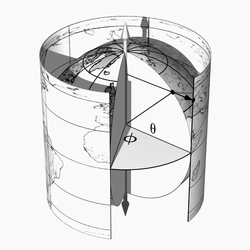 垂直于軸心的平面把球面切割成互相平行的緯線(parallels)。緯線將會(huì)隨著離極點(diǎn)越靠近而變得越短小。兩極中間的赤道是相當(dāng)特殊的一條緯線;它是所有緯線中最長(zhǎng)的一條。其余的緯線皆位于赤道以北或以南,且并各由被稱為緯度的角度(圖中標(biāo)示為綠色)確認(rèn)。