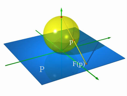 它的定義很簡(jiǎn)單。我們考慮一與地球在南極相切的平面 P。對(duì)球面上(除了北極之外)的每一點(diǎn) p,我們畫出一條連接北極與點(diǎn) p 的直線 pn。這條直線與切平面P 交于另一點(diǎn)