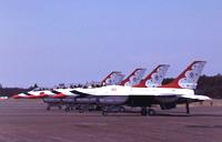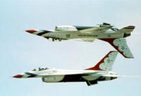 “雷鳥”飛行表演隊(duì)一共使用過六種型號(hào)的表演飛機(jī)。成立初期使用的表演機(jī)是F-84“雷電噴氣”(Thunderjet)式飛機(jī)。1956年6月?lián)Q裝為第一代超音速戰(zhàn)斗機(jī)F-100“超佩刀”(Super Sabre)式,成為世界上第一支超音速飛行表演隊(duì),大本營(yíng)也從盧卡移至美國(guó)最大的空軍基地之一的內(nèi)華達(dá)州的內(nèi)利斯基地。1964年初,換裝為F-105“雷公”(Thunderchief)式戰(zhàn)斗轟炸機(jī),由于技術(shù)上的缺陷,僅表演了6場(chǎng),就停止使用了,不得不又重新使用F-100。 1969年,換裝為著名的F-4“鬼怪”(Phantom)式兩倍音速重型戰(zhàn)斗機(jī),該型機(jī)作戰(zhàn)性能甚佳,在越戰(zhàn)中名聲顯赫,但噪音較大;不太適合于表演,所以在1973年11月被T-38A“禽爪”(Talon)高性能教練機(jī)所取代,該機(jī)的一大特色是噪音小。1976年5月5日,在慶祝美國(guó)建國(guó)200周年的慶典活動(dòng)中,“雷鳥”飛行表演隊(duì)完成了它的第2000場(chǎng)正式飛行表演。1982年,“雷鳥”飛行表演隊(duì)換裝了世界上最先進(jìn)的F-16“戰(zhàn)隼”(Fighting Falcon)式戰(zhàn)斗機(jī),一直使用至今。目前,“雷鳥”飛行表演隊(duì)標(biāo) 準(zhǔn)編制人員為130名,其中飛行員10名,地勤和保障人員120名。編制表演飛機(jī)15架,出訪表演時(shí),還可得到兩架C-141大型運(yùn)輸機(jī)和KC-10加油機(jī)的保障。