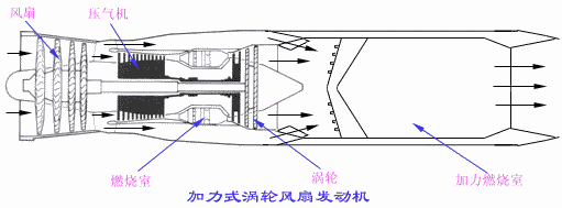 加力式渦輪風(fēng)扇發(fā)動(dòng)機(jī)在飛機(jī)巡航中是不開加力的,這時(shí)它相當(dāng)于一臺(tái)不加力式渦輪風(fēng)扇發(fā)動(dòng)機(jī),但為了追求高的推重比和減小阻力,這種發(fā)動(dòng)機(jī)的涵道比一般在1.0以下。在高速飛行時(shí),發(fā)動(dòng)機(jī)的加力打開,外涵道的空氣和渦輪后的燃?xì)庖煌M(jìn)入加力燃燒室噴油后再次燃燒,使推力可大幅度增加,甚至超過了加力式渦輪噴氣發(fā)動(dòng)機(jī),而且隨著速度的增加,這種發(fā)動(dòng)機(jī)的加力比還會(huì)上升,并且耗油率有所下降。加力式渦輪風(fēng)扇發(fā)動(dòng)機(jī)由于具有這種低速時(shí)較油耗低,開加力時(shí)推重比大的特點(diǎn),目前已在新一代殲擊機(jī)上得到廣泛應(yīng)用。