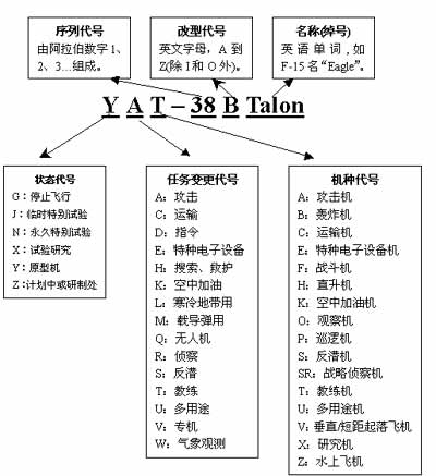 1962年,美國國防部規(guī)定了軍用飛機的統(tǒng)一命名方法,即命名使用代號和名稱,代號則包括機種代號、序列代號、改型代號、任務變更代號和狀態(tài)代號。具體說明如下: