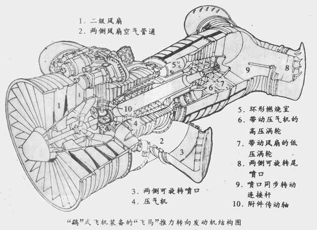 英國的“鷂”式(Harrier)就是使用偏轉(zhuǎn)噴管方式的垂直起落飛機(jī)。這種飛機(jī)機(jī)身中部安裝有一臺“飛馬”式推力轉(zhuǎn)向發(fā)動機(jī)(“飛馬”發(fā)動機(jī)結(jié)構(gòu)圖),前后兩對可旋轉(zhuǎn)噴口分別位于機(jī)身兩側(cè),相對機(jī)身重心保持對稱。發(fā)動機(jī)將從進(jìn)氣道吸入的空氣一部分通過前面的兩個可旋轉(zhuǎn)噴口噴出,另一部分經(jīng)過燃燒室和渦輪從后面的兩個可旋轉(zhuǎn)噴口噴出,四個噴口噴出的氣流共同產(chǎn)生供飛機(jī)垂直起降、空中懸停和水平飛行的動力(圖為“鷂”式垂直起飛示意圖)。
