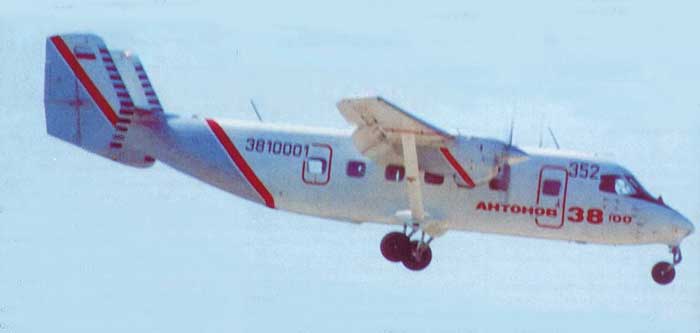安-38是烏克蘭安東諾夫航空科研技術(shù)聯(lián)合體研制的雙發(fā)渦槳輕型多用途支線飛機(jī),由安-28發(fā)展而來,采用了新的發(fā)動(dòng)機(jī),加長(zhǎng)的機(jī)身,裝有氣象雷達(dá)和飛行自動(dòng)控制系統(tǒng),機(jī)輪或滑撬能在未鋪設(shè)跑道和-50℃~+45℃的環(huán)境下使用。使用壽命 3000小時(shí),飛行的維護(hù)工作量為4人時(shí)。1991年安-38在巴黎航展上首次亮相,首批6架,第一架原型機(jī)于1996年6月23日首飛(裝TPE331發(fā)動(dòng)機(jī))。 1996年第四季度獲國(guó)際民航組織型號(hào)合格證,投入成批生產(chǎn);計(jì)劃1997年生產(chǎn)25架,1998年50架,1999年75架,2000年200架。主要型別有安-38-100,第一架和第二架原型機(jī)安裝聯(lián)信公司的TPE331發(fā)動(dòng)機(jī),安-38-200,第四架和第五架飛機(jī),安裝TVD-20發(fā)動(dòng)機(jī)(第三架飛機(jī)用作靜力試驗(yàn));安-38K,-100的改進(jìn)型,左側(cè)有大艙門,可以裝載4個(gè)LD-3或5個(gè)LD-3K集裝箱,拆除載貨設(shè)備可裝30個(gè)座椅;還有安裝TDV-1500發(fā)動(dòng)機(jī)的方案。安-38可用于客/貨運(yùn)輸、要人專機(jī)、巡邏、測(cè)量等。