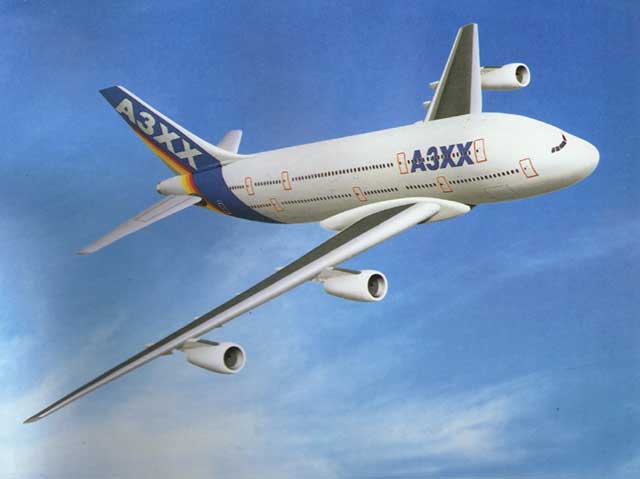 A3XX是空中客車工業(yè)公司計劃研制的一種四發(fā)洲際航程寬體客/貨兩用運輸機。預計該機將采用下單翼,及4-6輪大型 主起落架和單輪前起落架。工程階段始于1994年6月初,設計載客530-850名。
