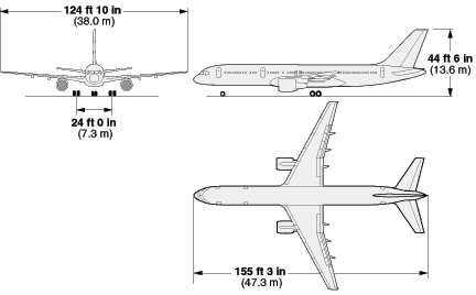 尺寸數(shù)據(jù):翼展38.05米,機(jī)長(zhǎng)47.32米,機(jī)高13.56米,機(jī)翼面積185.25平方米,1/4弦線后掠角25°,客艙36.09米×3.53米×2.13米。