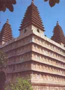 五塔是在由須彌座和五層佛龕組成的矩形平面高臺(tái)上,再建五座密檐方塔。臺(tái)座南面開(kāi)一高大圓拱門,由此可循梯登臺(tái),臺(tái)上中央的密檐塔較高,十三層;四角的較小,十一層。