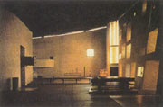 這個教堂的設計中,勒.柯布西耶把重點放在建筑造型上和建筑形體給人的感受上。他摒棄了傳統(tǒng)教堂的模式和現(xiàn)代建筑的一般手法,把它當作一件混凝土雕塑作品加以塑造。教堂造型奇異,平面不規(guī)則;墻體幾乎全是彎曲的,有的還傾斜;塔樓式的祁禱室的外形象座糧倉;沉重的屋頂向上翻卷著,它與墻體之間留有一條40厘米高的帶形空隙;粗糙的白色墻面上開著大大小小的方形或矩形的窗洞,上面嵌著彩色玻璃;入口在卷曲墻面與塔樓的交接的夾縫處;室內(nèi)主要空間也不規(guī)則,墻面呈弧線形,光線透過屋頂與墻面之間的縫隙和鑲著彩色玻璃的大大小小的窗洞投射下來,使室內(nèi)產(chǎn)生了一種特殊的氣氛。
