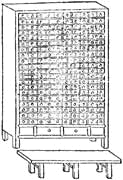 制字柜。按照康熙字典的十二干支分類法,將活字分別排列在十二個木柜中。每個木柜高五尺七寸,寬五尺一寸,進深為二尺二寸,木柜腿高一尺五寸,每個木柜配備一條木凳,木凳的高度與柜腿的高度相等,以便站在凳子上取字。每個柜子做二百個抽屜,每個抽屜分為大小八個格子,每個格子中放入大小字母各四種,在各個抽屜的面板上寫上這四種字母的屬于某部某字及筆畫數(shù)。取字時先按照偏旁知道該字屬于哪部放在哪個柜子中,再查筆畫數(shù),便知該字放在哪個抽屜內。熟練之后,需要的字伸手便可取到。生僻的字平常使用不多,可以少刻,另外造一個小木柜收藏。將小木柜放在大木柜的上面,可以一目了然,撿字也十分方便。